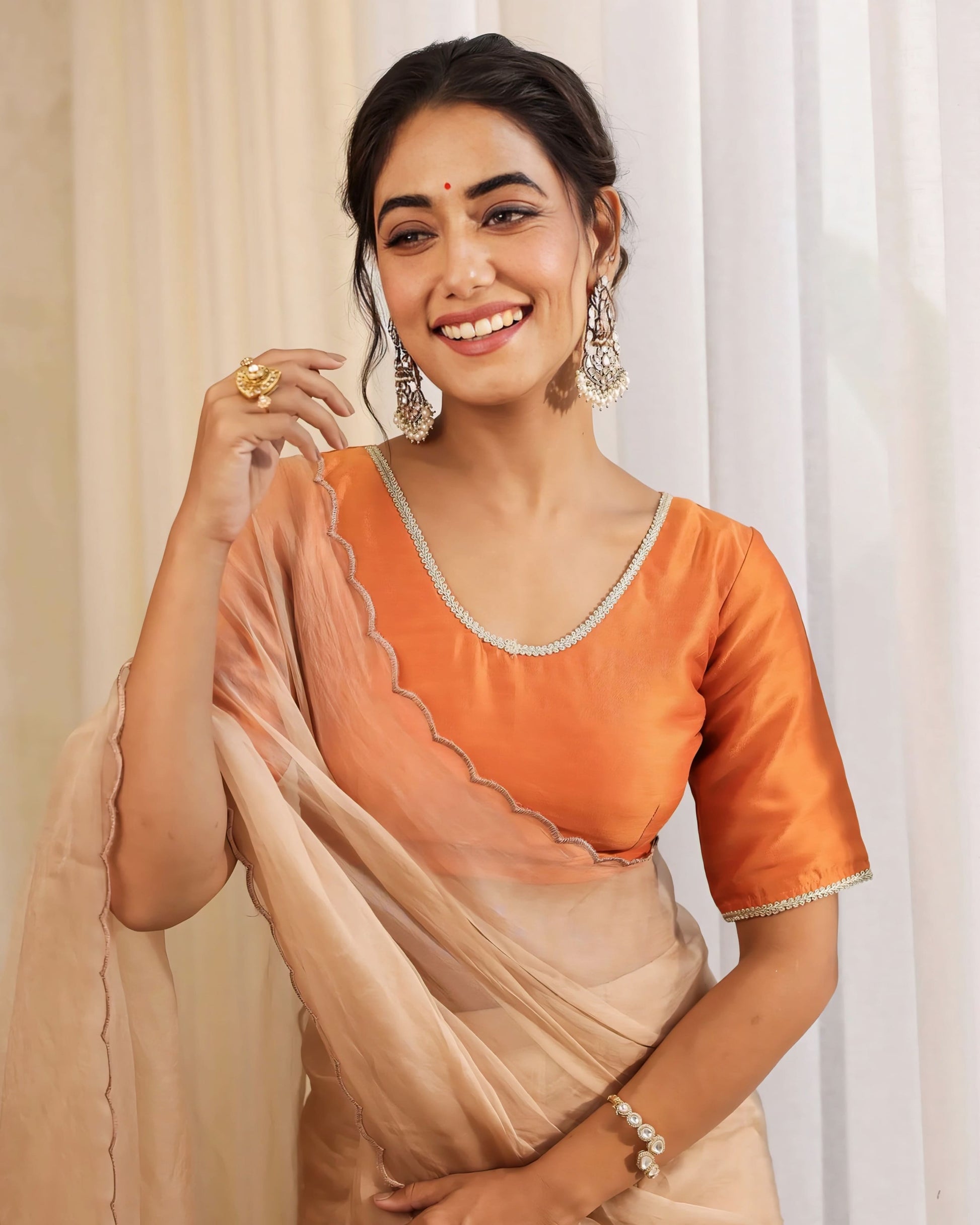 Add refined elegance to your ethnic wardrobe with this beautifully tailored princess cut blouse in a rich burnt orange tone. Designed to flatter the feminine silhouette, this blouse blends classic charm with modern structure.