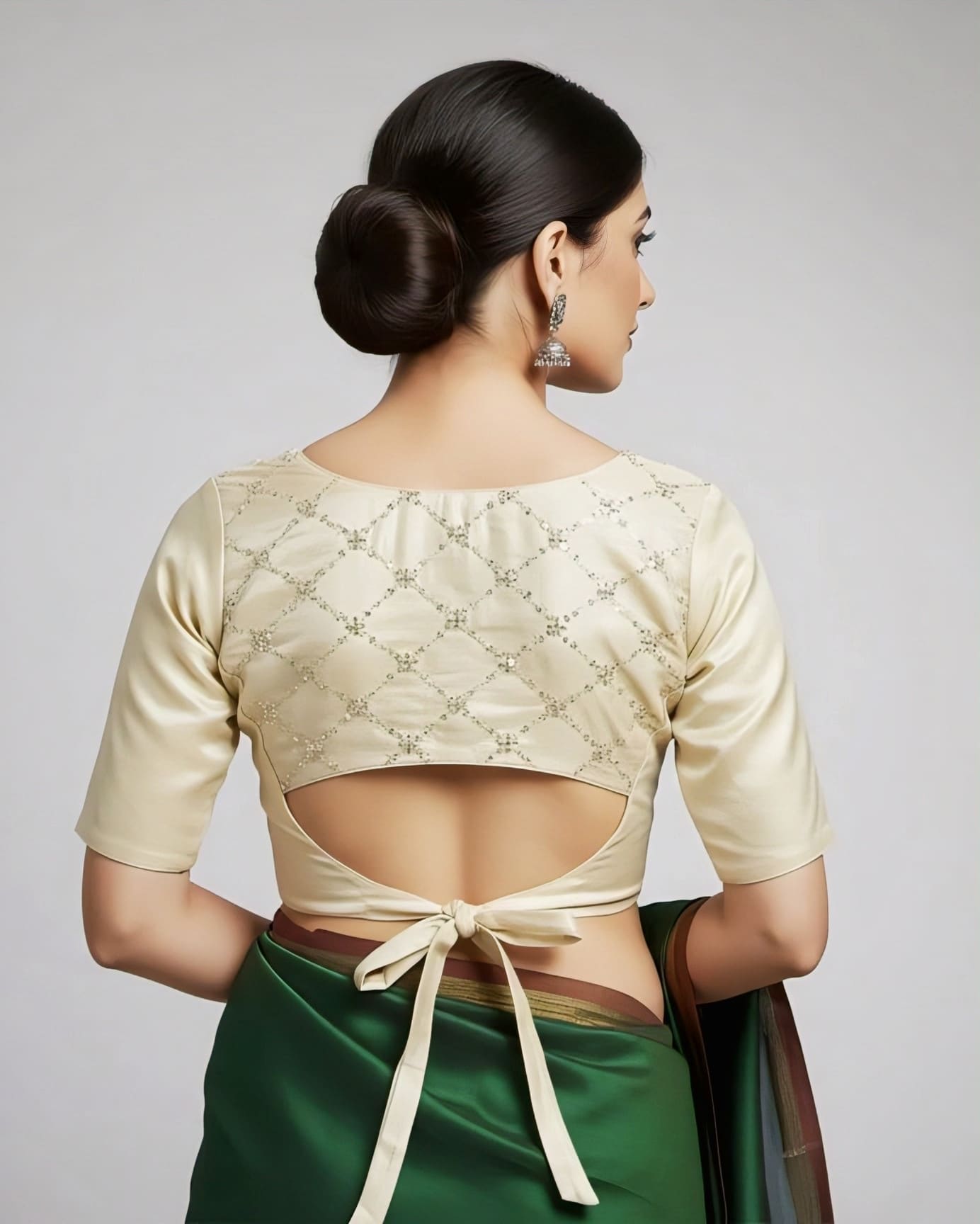 The minimal aesthetic makes this blouse incredibly versatile. Whether paired with rich silk sarees, designer georgette drapes, organza sarees, or embroidered bridal sarees, it balances heavy ensembles with understated elegance. The neutral champagne-gold tone adds a royal touch, making it easy to coordinate with vibrant jewel tones like emerald green, royal blue, maroon, or deep pink.