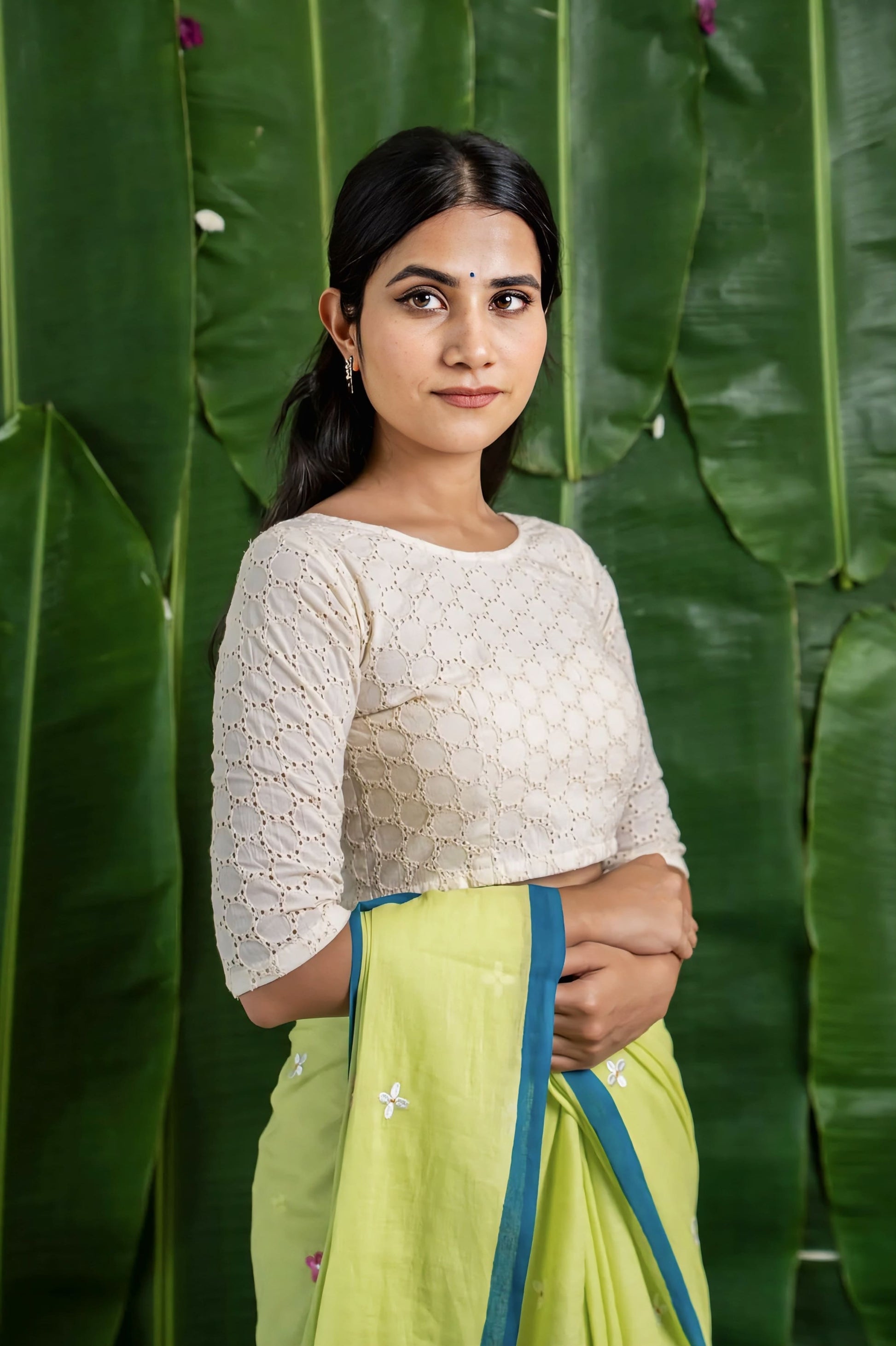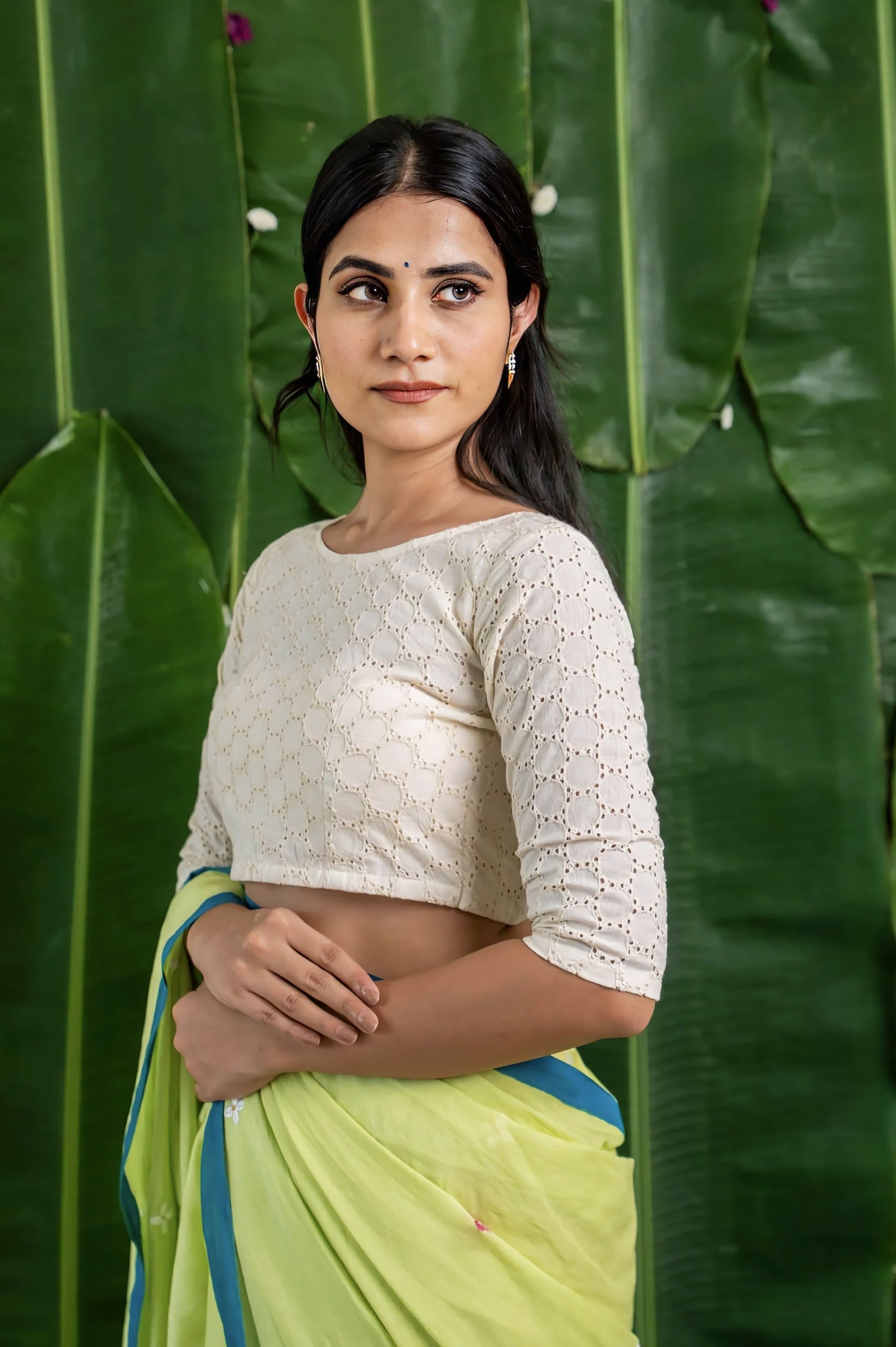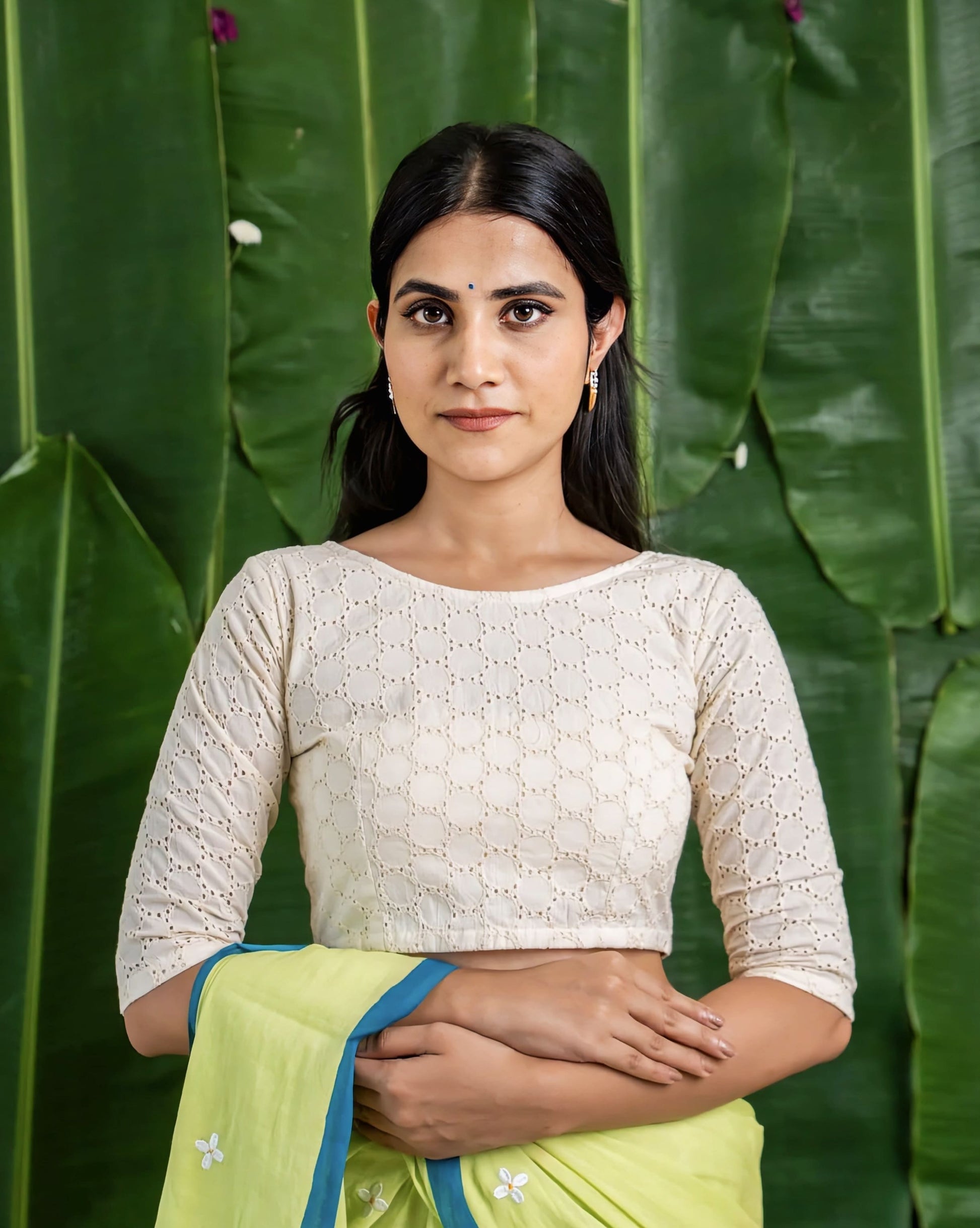 This fancy blouse design features intricate circular lace patterns that create a rich textured finish. The classic round neckline enhances its minimalist appeal, while the tailored 3/4 sleeves add both comfort and elegance. The structured fit beautifully complements the saree silhouette, making it ideal for festive celebrations, intimate weddings, poojas, and elegant day events.
