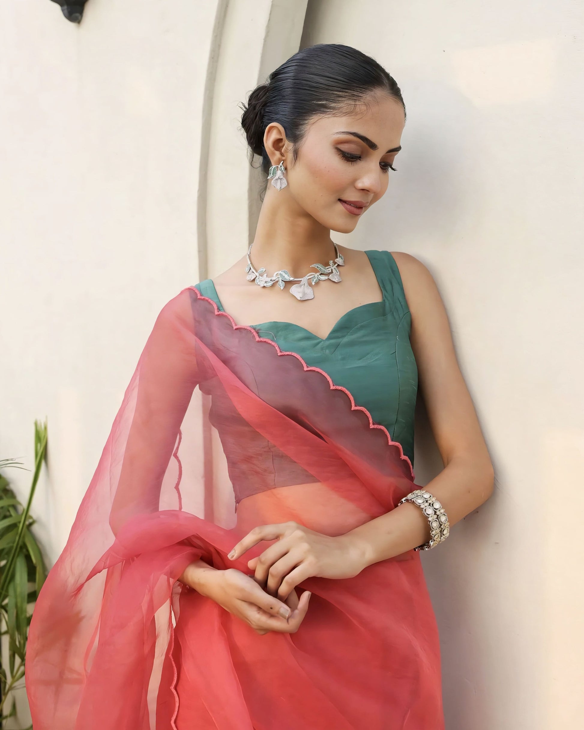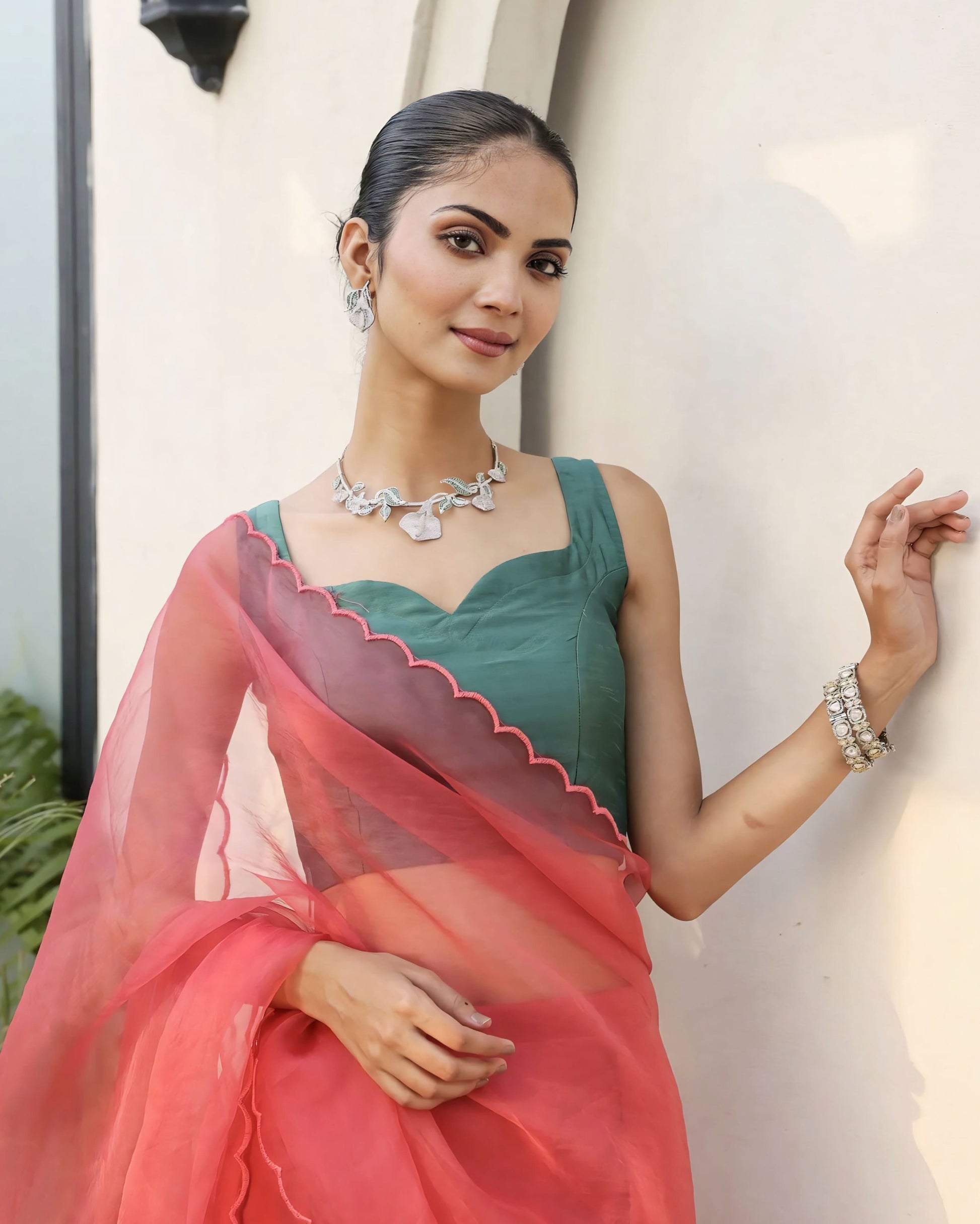 The sleeveless design keeps the look modern and allows effortless pairing with sheer and lightweight sarees.