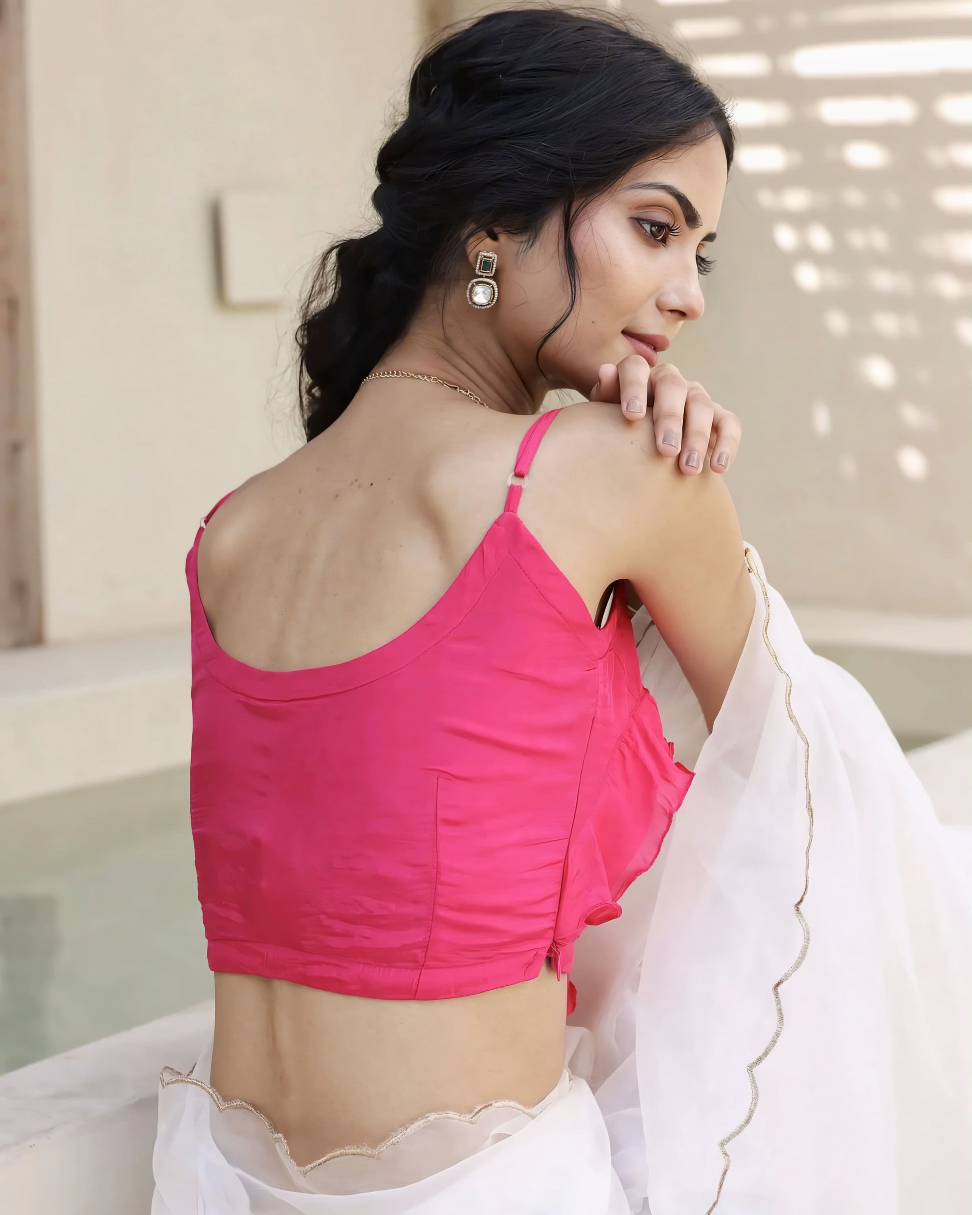 The spaghetti straps add a delicate, modern touch, making this blouse ideal for lightweight and sheer saree drapes.