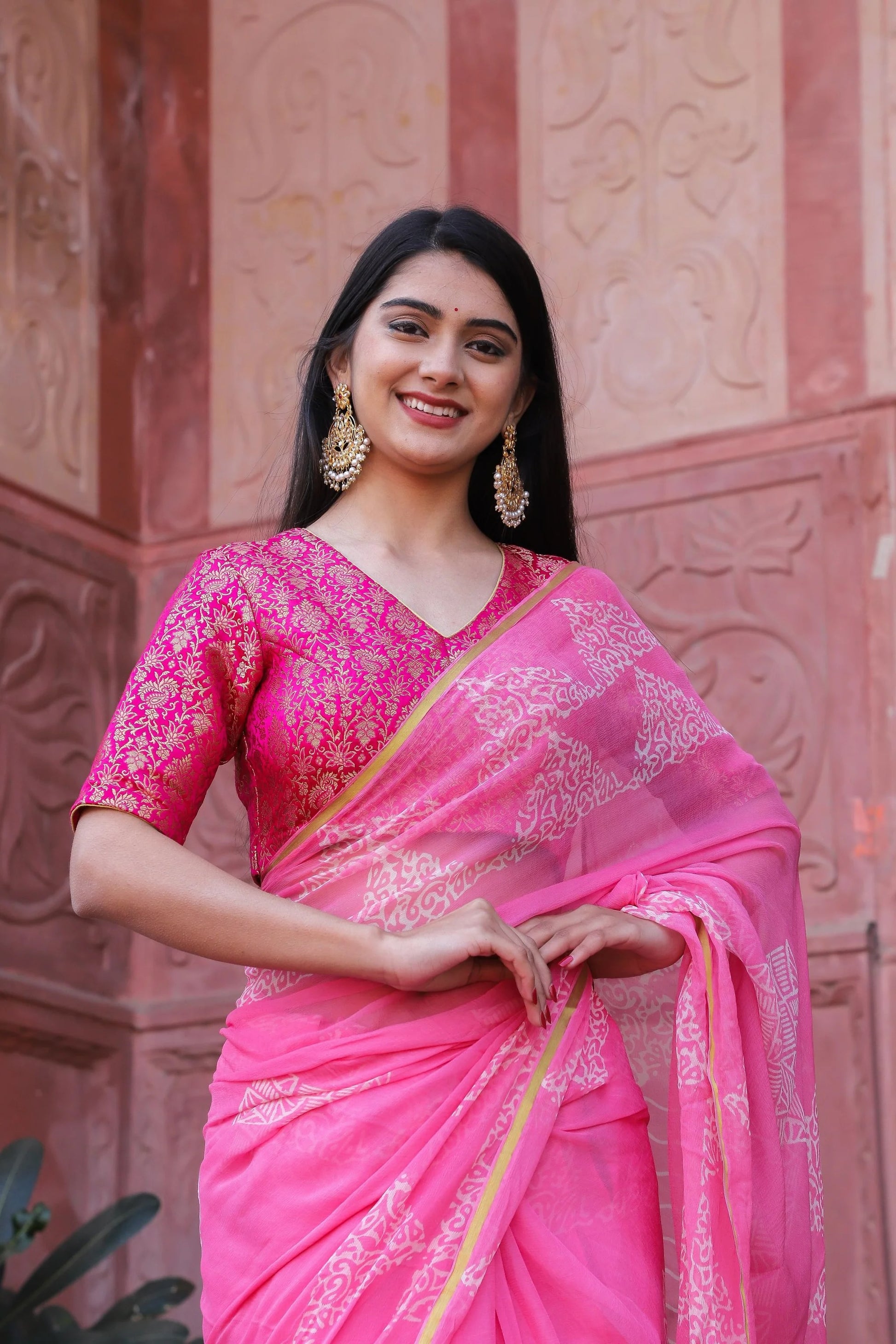 Indian Traditional Hand Printed Pink Chiffon Saree with Zari Border