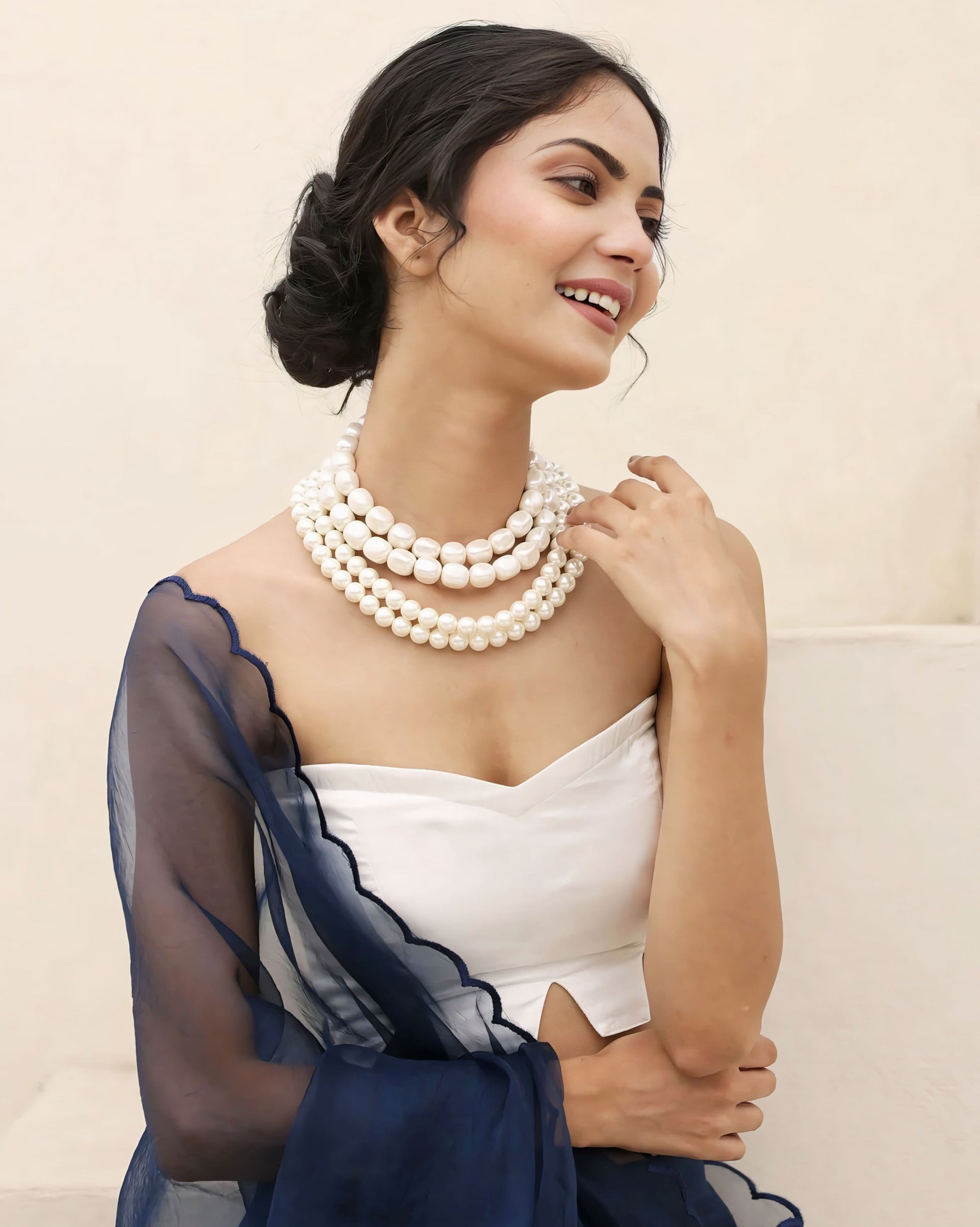Style with pearl strands, statement earrings, and a sleek bun or soft updo for a polished, high-fashion ethnic look.