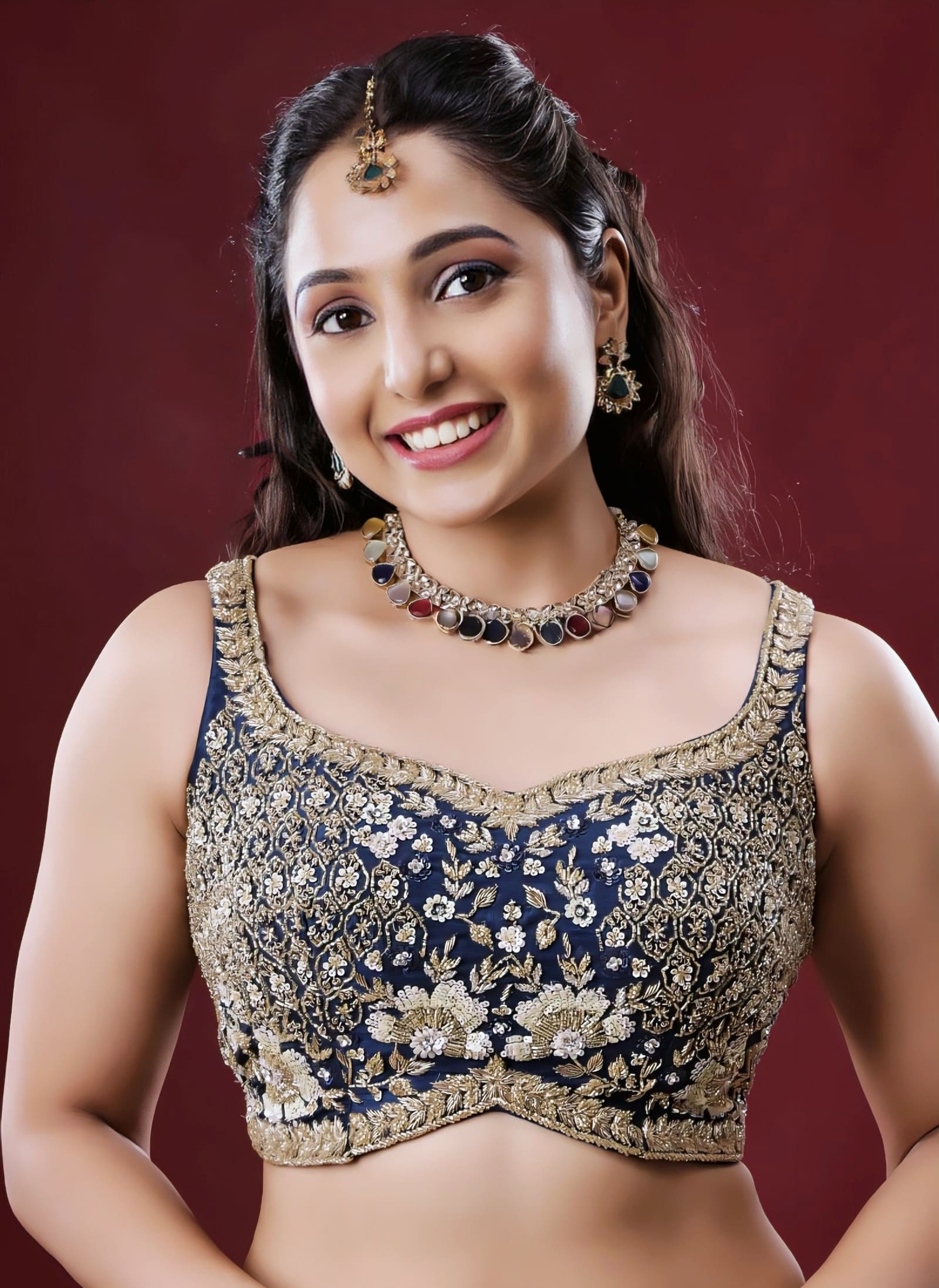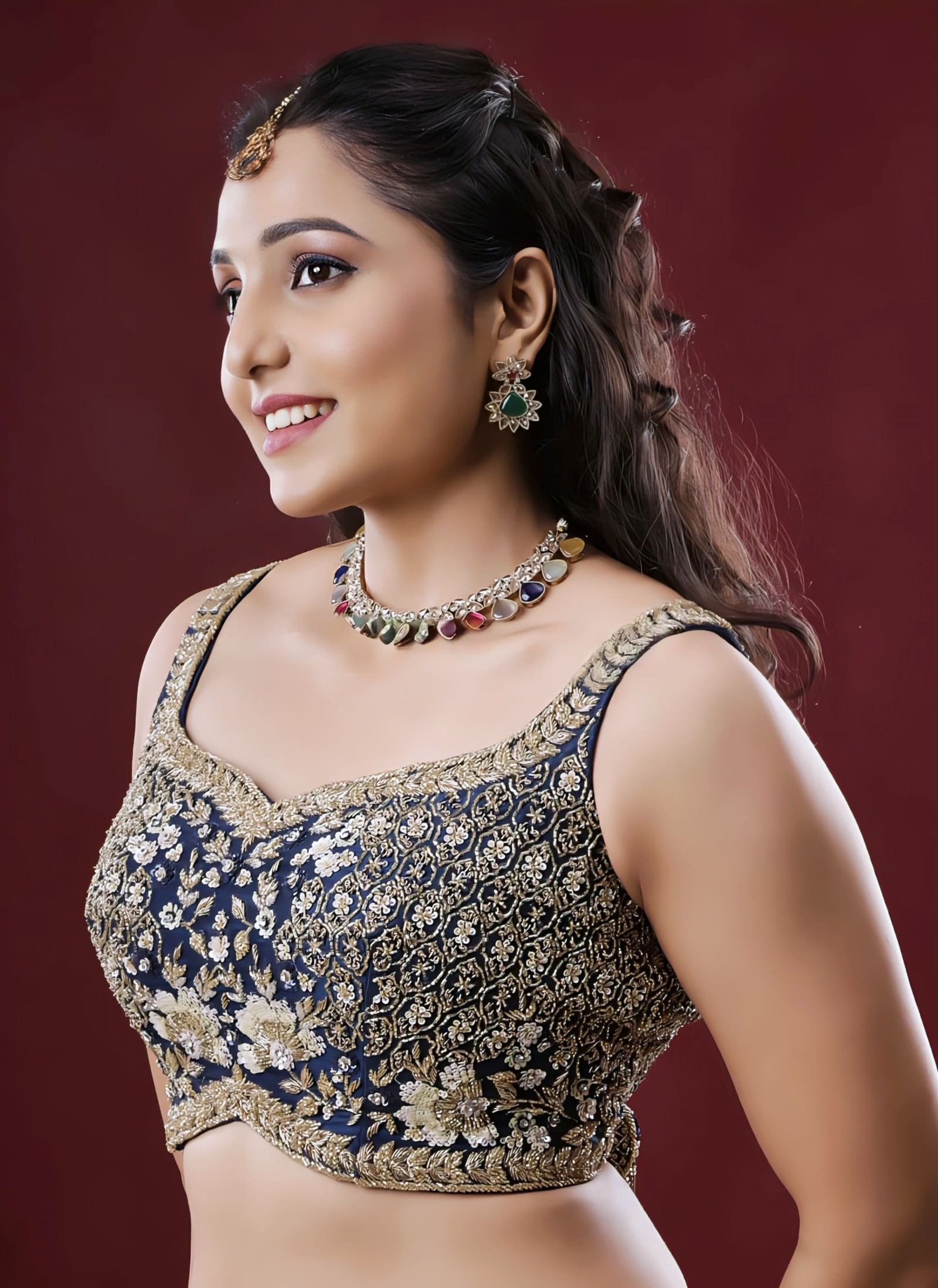 Finished with a smooth inner lining and a richly embroidered hemline, this blouse ensures durability, comfort, and a couture-quality finish. The deep navy blue base paired with opulent gold work makes it an ideal choice for statement ethnic looks.