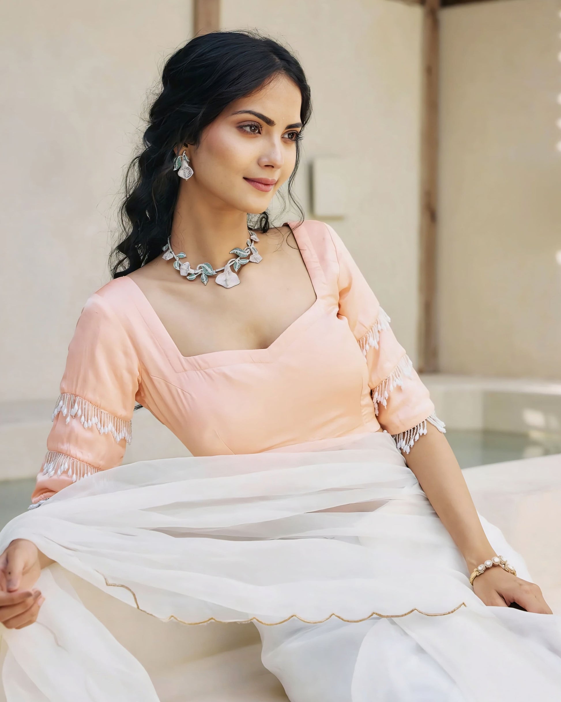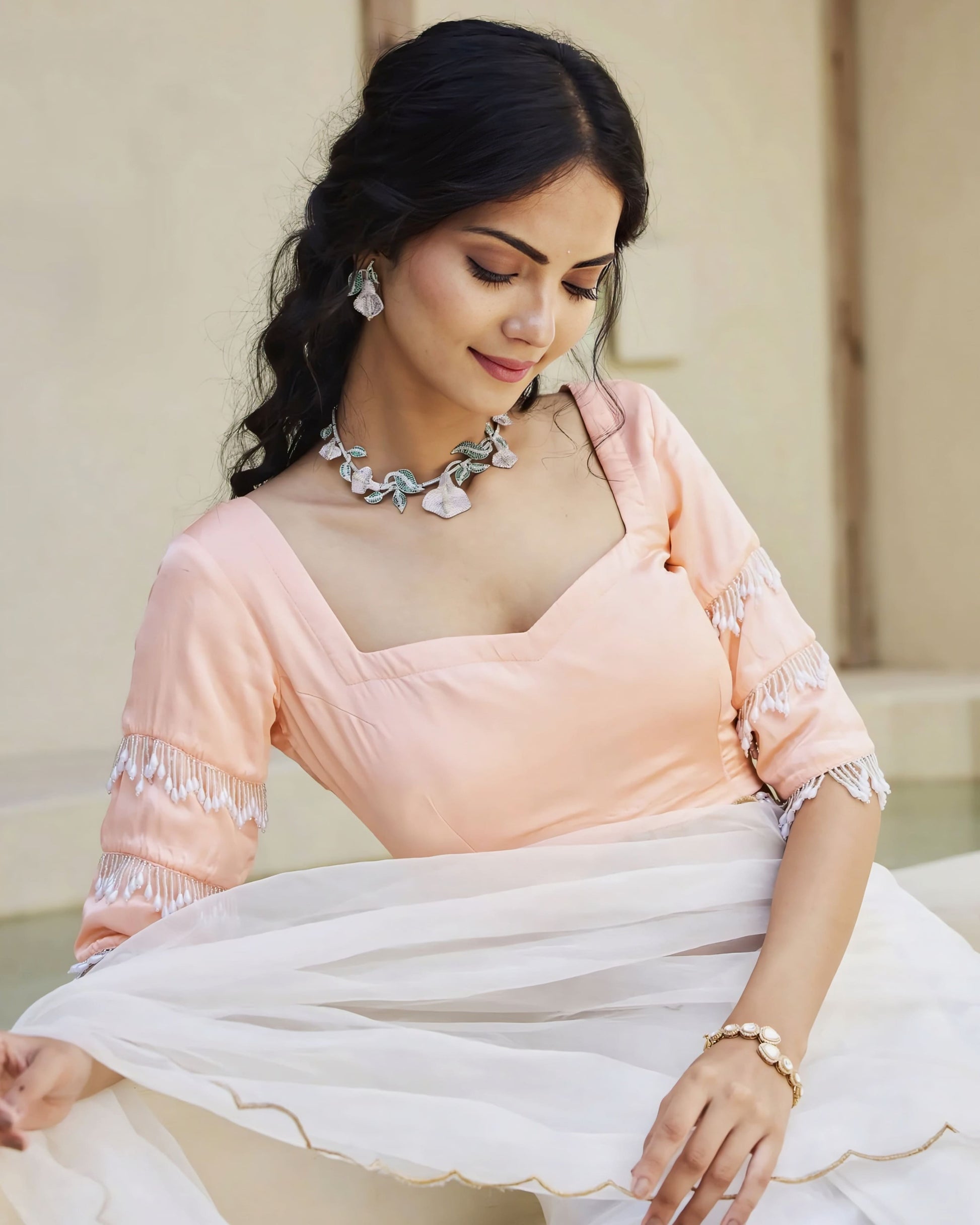 This soft peach princess cut blouse is designed to bring effortless elegance to your saree look. It features a structured sweetheart-style neckline that enhances the bust line while maintaining a graceful, feminine appeal.