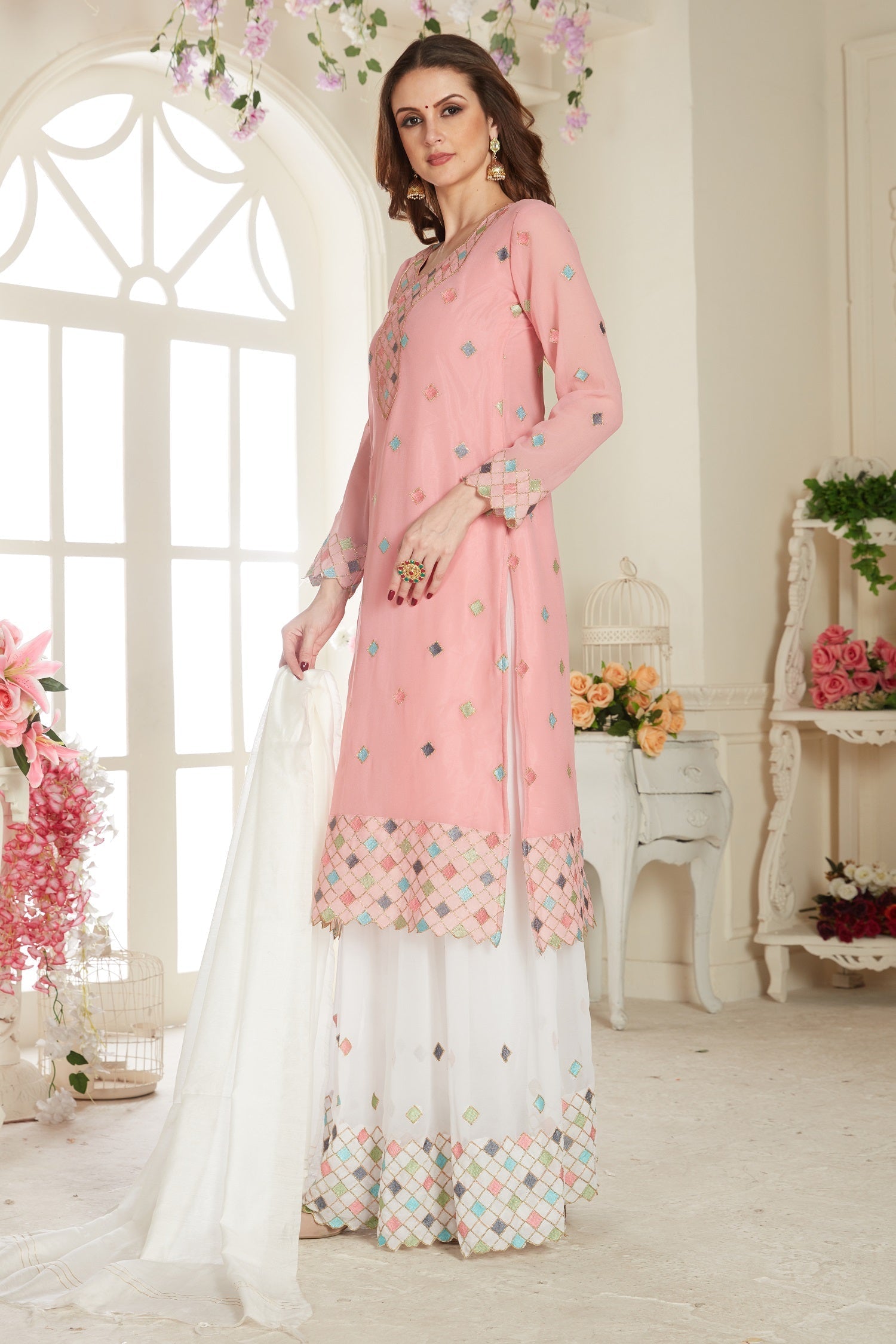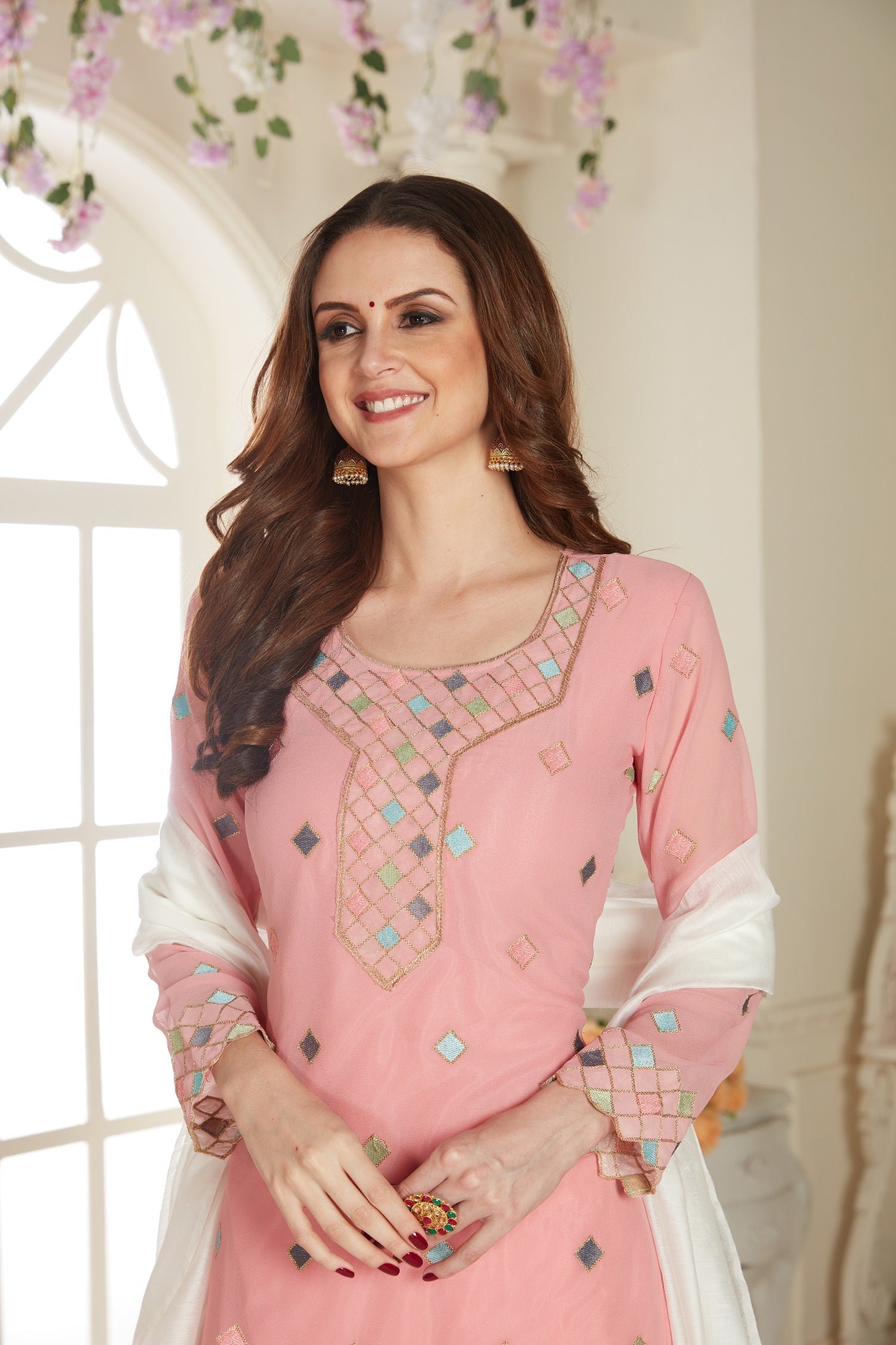 Pink Fancy Net With Soft Silk Inner Semi-Stitched Designer Gown Suit