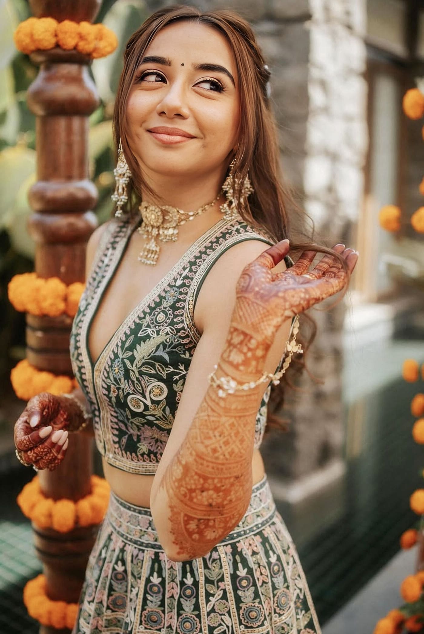 What makes this ensemble truly special is its story—each motif is hand-embroidered over months by skilled women artisans from Self Employed Women’s Association (SEWA), an organization dedicated to empowering women financially while preserving traditional craftsmanship.