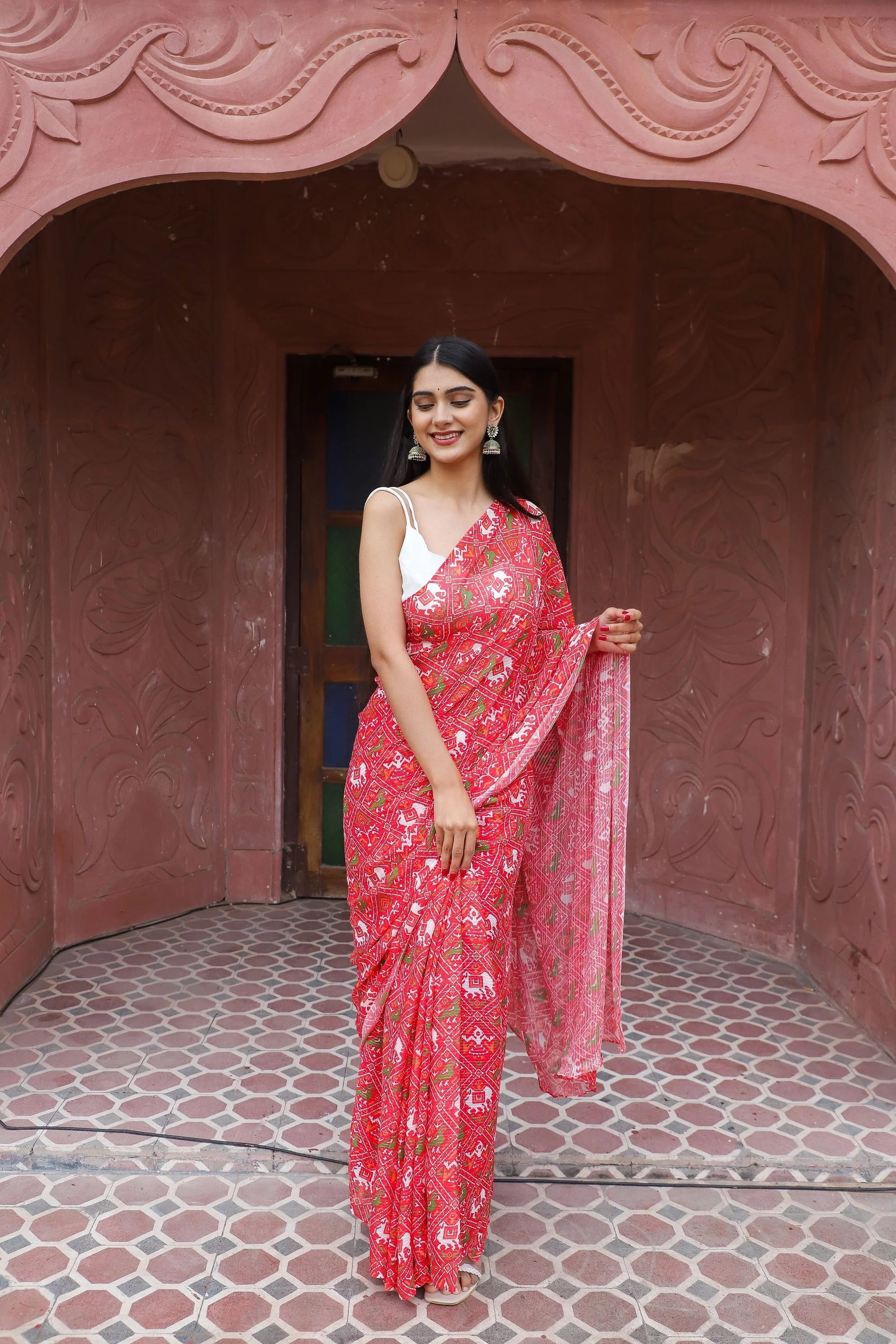Step into the spotlight with our Patola printed saree, blending traditional Gujarat artistry with the elegance of pure viscose georgette. This 5.5-meter saree showcases intricate Patola prints enhanced with sequins and thread work, offering a beautiful fusion of ancient craftsmanship and modern style. The multicolored stripes on a rich maroon background bring a festive charm, making it perfect for any celebration. Lightweight and flowy, this saree ensures comfort and grace, with a matching blouse included. Reserve your piece today and celebrate in style!